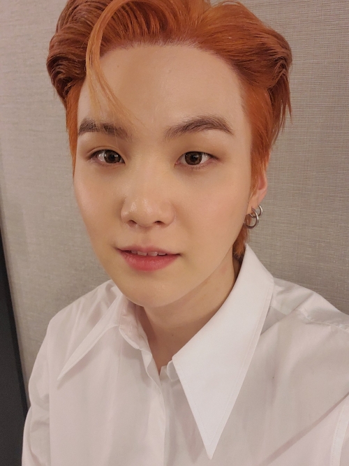 写真には、白シャツ姿のSUGAの姿が写っている。何より目を引くのは、新しいヘアカラーだ。イメージチェンジした鮮やかなオレンジヘアーがSUGAの白い肌によくマッチしている。