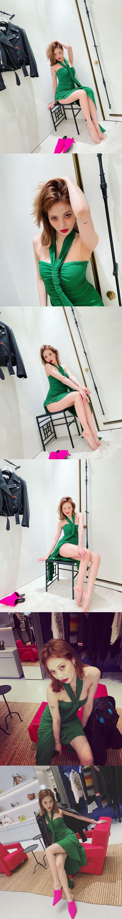 写真には、フィッティングルームでポーズを決めるヒョナの姿が。腕や脚が露出した大胆な緑のドレスを着こなし、目が眩むような脚線美を見せつけている。