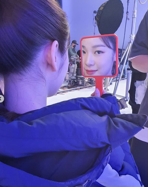 キム・ヨナは11月29日、自身のSNSに撮影現場と見られる場所でメイクアップを確認する写真を掲載したが、ちょうど鏡に映った自分の姿を確認すると、無表情だった顔から一転してにっこりと微笑んだ。