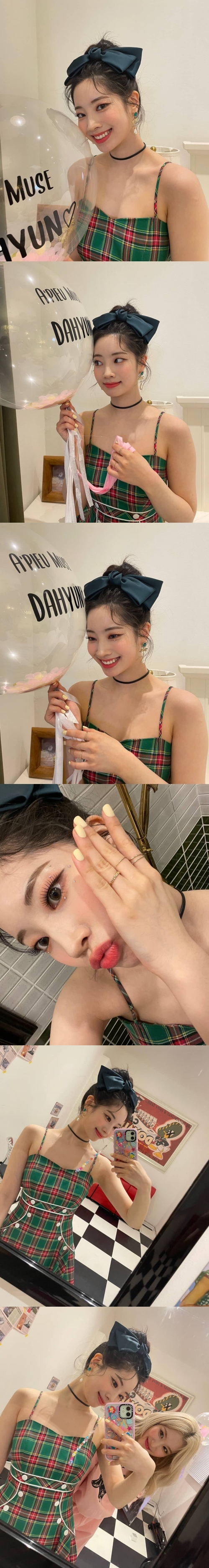 写真には、こちらを見つめるダヒョンの姿が。大きなリボンにチェック柄のキャミワンピースというキュートな“クリスマスコーデ”を完成させている。
