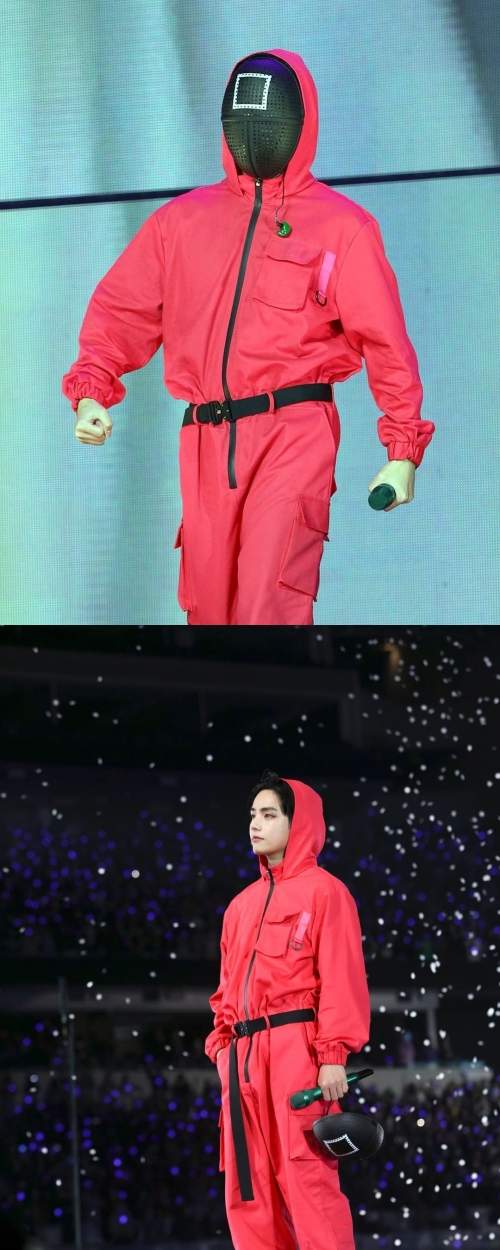 写真にはコンサートのアンコールで披露した、『イカゲーム』の運営スタッフに変身したVが写っている。