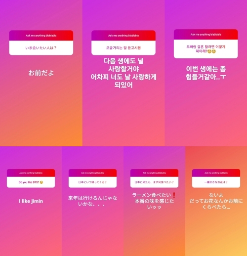 続けて、「くさいセリフ聞きたい」というファンのリクエストには「来世もお前を愛すよ。どうせお前も俺のこと好きになるだろうから」とロマンチックに返答したかと思うと、「オッパ(兄さん)と結婚するためにはどうしたらいい?」という質問には「現世では難しいかも…T」と容赦のない返しをすることも。「BTSは好き?」という質問には「ジミンが好き」と答えた。