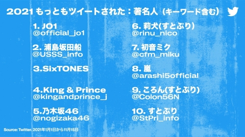 Twitter Japanは12月9日、国内のTwitter上で最も言及されたアカウントやハッシュタグなどをジャンル別に発表。「2021年最もツイートされた著名人」にJO1が選ばれた。
