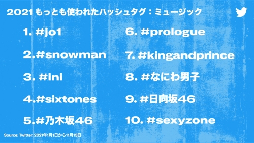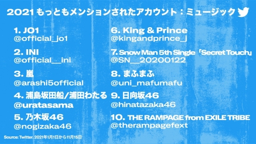 さらに、「2021年最もメンションされたアカウント」「2021年最も使われたハッシュタグ」(ミュージック編)でも首位を獲得。人気と影響力の高さを証明している。