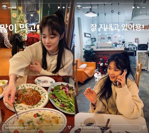チャン・ナラは12月9日、自身のインスタグラムのストーリーに「たくさん食べながら!元気に過ごしています!」という文章を添えて写真を投稿した。