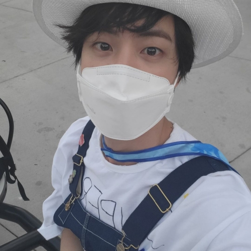 ハットにオーバーオールというキュートな装いを見せているJIN。よく見ると、この格好はJINの誕生日記念として公開されたソロ曲『SUPER TUNA』の衣装であることがうかがえる。