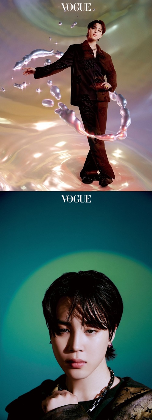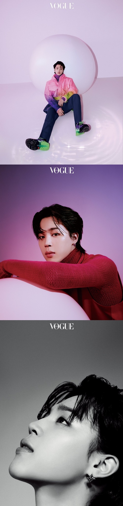 撮影現場の最初の衣装として、薄ピンクに紫と薄緑がグラデーションされたジャケットを選んだJIMINは、「僕は単色のすっきりした服が好きだけど、今回は挑戦してみました。おもしろかったです。消化するのは難しかったけど(笑)。服が好きですが、実際のところは、ファンの方々に見せる楽しさで買い物をしていたんです。でも最近は、着てお見せする機会がないから、運動服しか買っていません」と話した。