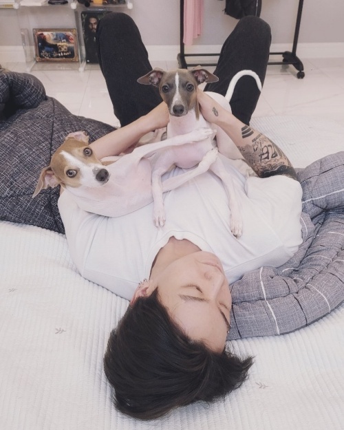 写真には、自宅で寝転ぶJUNG KOOKの姿が。犬を両腕に抱えながら、どこかを見つめている。この2匹の犬「ソンイ」と「ペンイ」は、JUNG KOOKの実兄が飼っている犬らしく、JUNG KOOKのインスタグラムにもたびたび登場している。