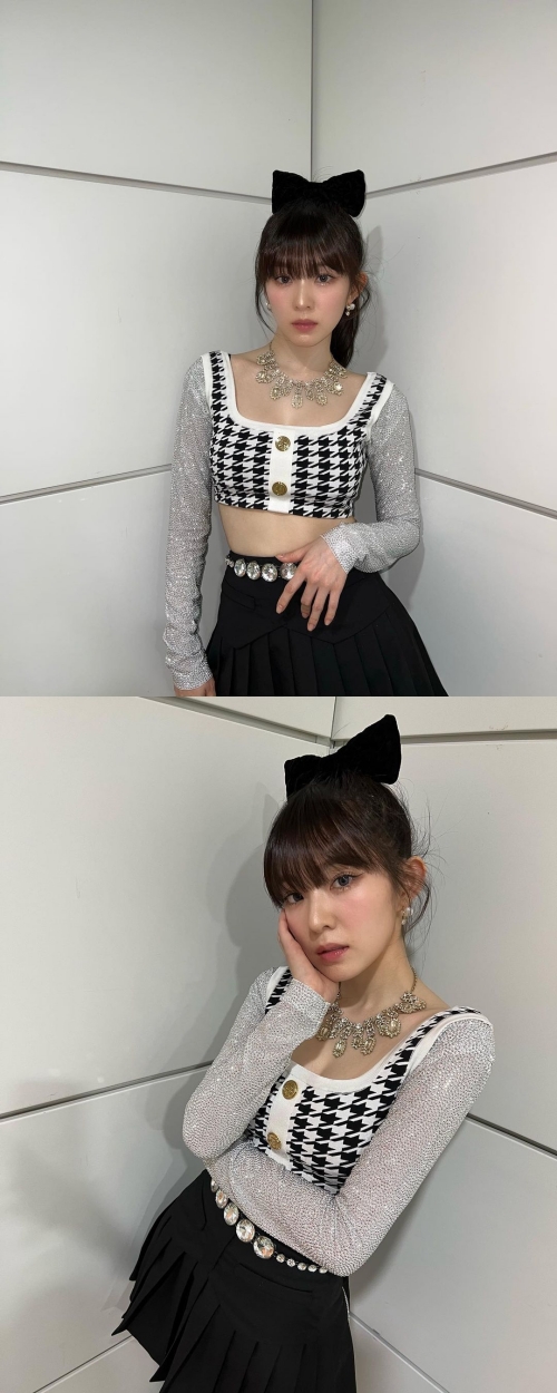 写真には、黒の大きなリボンが主役のスタイリングを披露するアイリーンの姿が。クロップドトップスからは華奢なデコルテとウエストがのぞいており、ビジューよりも輝く美貌が目を引く。