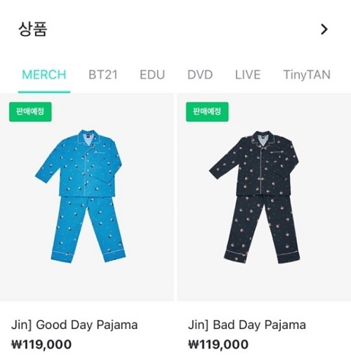 JINは「Good Day」と「Bad Day」の二種類のパジャマを準備。特に企画過程で、ファンがリラックスして眠ることができるように、綿のパジャマを作ってほしいとお願いした。