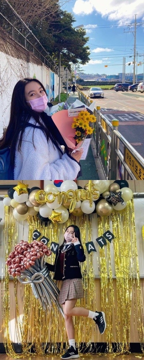 公開された写真は、中学校の卒業式に参加したカル・ソウォンの姿が。彼女は花束を持って、笑顔を見せた。マスクをしているが、『7番房の奇跡』当時と比較すると、美しく成長していることがわかる。