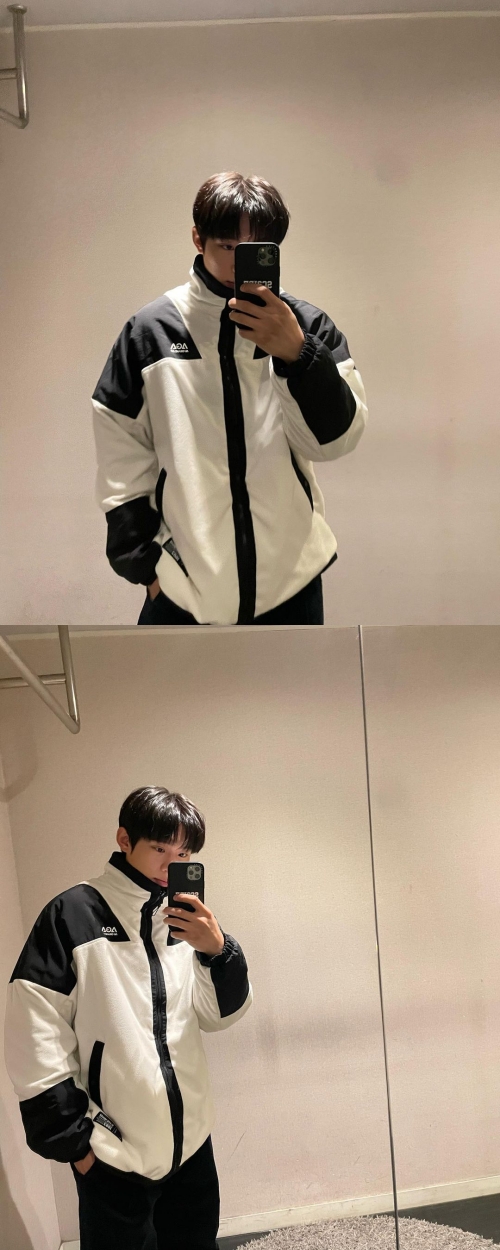 写真には、鏡の前で自撮りをするキム・ソンチョルの姿が。スポーティーなブルゾンを着用し、ジップを上まで閉めてスタイリッシュな印象を与えている。