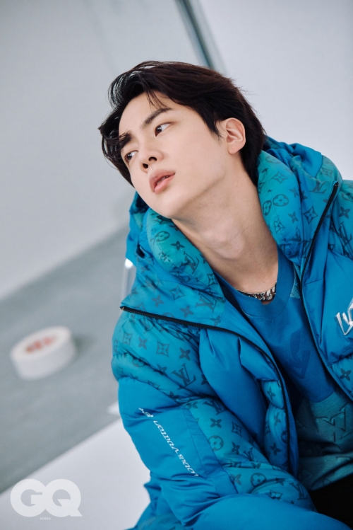 JINはルイ・ヴィトンのモノグラムが散りばめられたブルーのダウンコートに身を包んでいる。頭上のカメラを見つめながら真剣に撮影に臨む表情は、まさに“美”そのものだ。