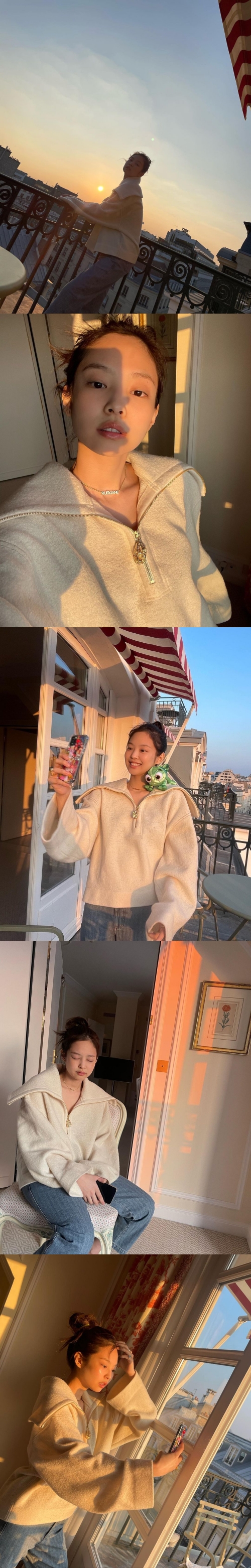 写真には、バルコニーでたたずむジェニーが写っている。夕日をバックにこちらを見つめており、オープンカラーのニットを着用したカジュアルな装いと、化粧気のないすっぴん姿が目を引く。