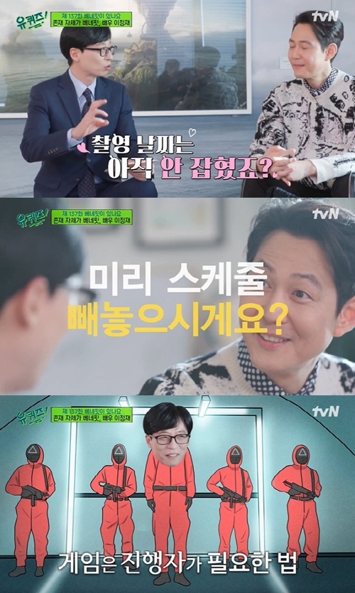 番組ホストのユ・ジェソクが「『イカゲーム』、シーズン2に続いて3もあると聞いたが、どうなのか?」とイ・ジョンジェに問いかけると、「シーズン3までは分からないが、シーズン2の制作は監督が決心した」とし、「『イカゲーム』は、誰か勝つことが面白いのではなく、さまざまな過去や事情を持った人たちが、どんな結末を迎えるのかについて描いた作品だから面白い。だからシーズン2を作ることは難しいと思った。でもシーズン1が大人気だったので、2は絶対に作らなければならない状況」と答えた。