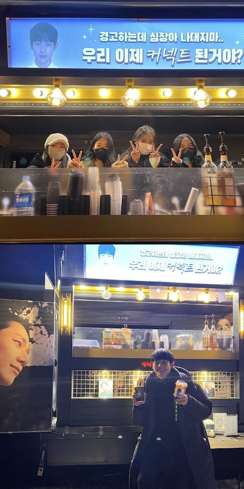 公開された写真には差し入れのコーヒートワゴンと共に『スノードロップ』に出演したBLACKPINKのジス、キム・ヘユン、チョン・シンヘ、チョン・イソの姿が映っている。彼女たちは、現在、映画『コネクト』(原題)を撮影しているチョン・ヘインを応援するためにサプライズで駆けつけた様子だ。