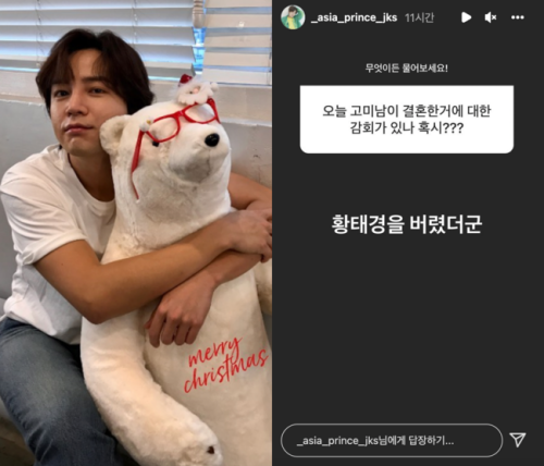 さらに、ファンの1人が、同日結婚式を挙げたパク・シネのニュースを伝えながら「今日コ・ミナム(演者パク・シネ)が結婚したけど感慨深い?」という質問に対しては、「ファン・テギョン(演者チャン・グンソク)は捨てられた」とユーモアに富んだ回答をしてみせた。