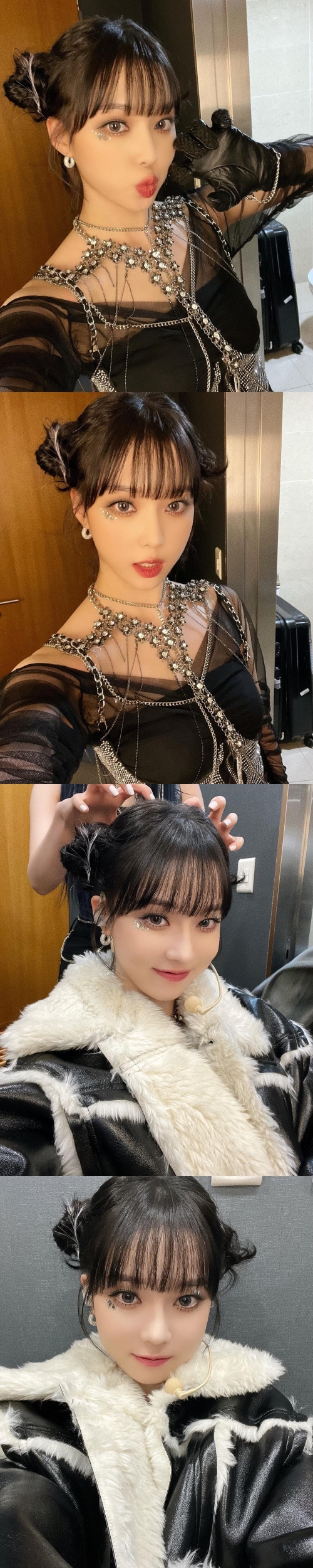 写真には、控え室で自撮りをするWINTERの姿が。ロングヘアを頭のてっぺんでふたつのお団子にしており、キュートな魅力を発揮している。