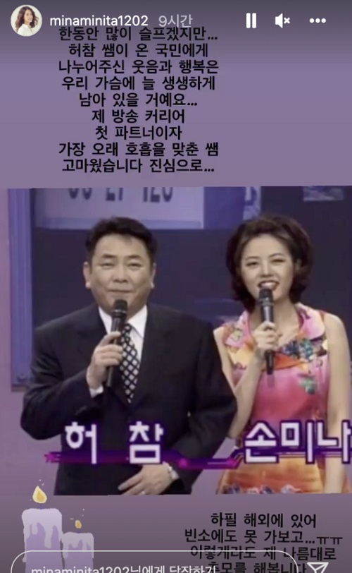 韓国のバラエティ番組『家族娯楽館』(原題)で25年間MCを務めたホ・チャムが肝臓がんでこの世を去ったなか、彼と司会のパートナーだった“後輩”ソン・ミナが追慕のメッセージを残した。
