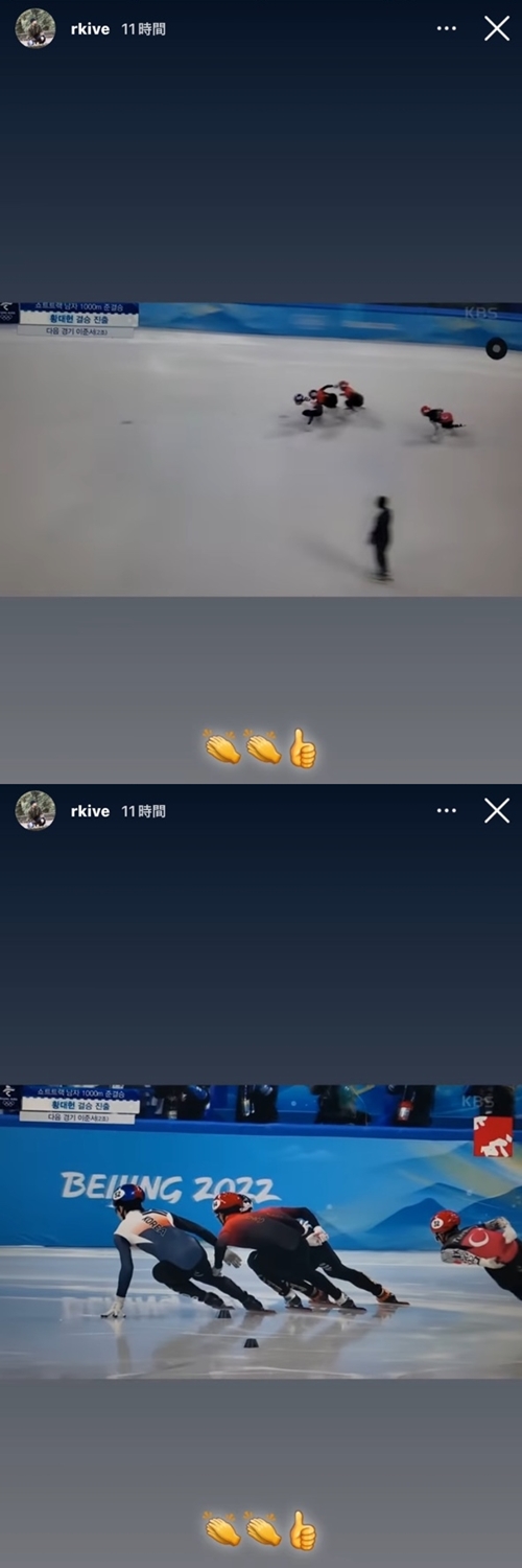 RMは2月7日、インスタグラムのストーリーにショートトラック男子1000m準決勝に進出した韓国代表ファン・デホンのハイライト映像を掲載。当時、ファン・デホンは中国代表選手2人をインコースで完璧に追い抜き、堂々の1位で決勝進出を決めたかに見えた。