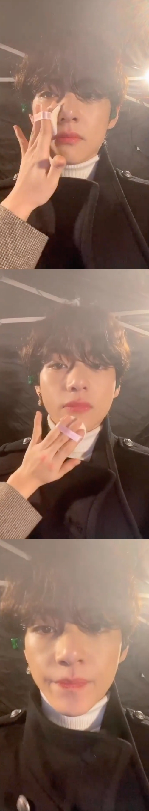 動画には、ステージ裏でメイクを受けるVの姿が。Vは至近距離での撮影にもかかわらず、欠点一つない優れたビジュアルを誇っており、その姿はまるで彫刻のようだ。