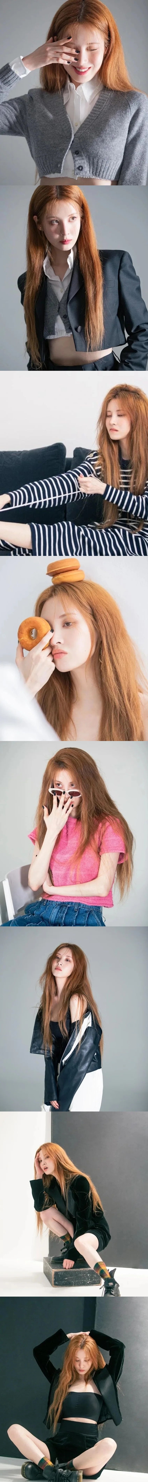 写真の中のソヒョンは、黒いレザージャケットや黒いセットアップを着て、挑発的な目つきやおぼろげな表情で官能的なオーラを醸しだした。