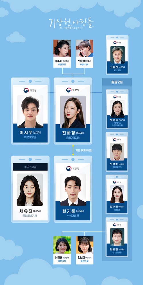韓国JTBCの新ドラマ『気象庁の人々:社内恋愛は予測不能?!』(演出チャ・ヨンフン、脚本ソン・ヨン)が公開した人物相関図で最も目立つのは社員証だ。この作品が日常の必須情報である天気を予報するが、実際にどんな場所なのかあまり知られていない気象庁を扱うということを強調している。