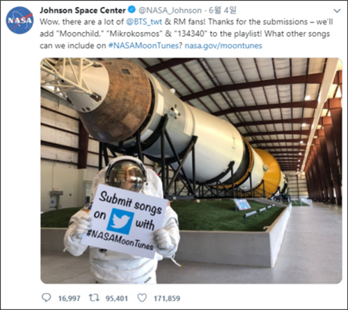 その後の6月5日、ジョンソン宇宙センターの公式Twitterには「BTSとRMのファンがとても多い! 意見に感謝する。『Moonchild』『Mikrokosmos』『134340』を再生リストに追加する」と綴られた。