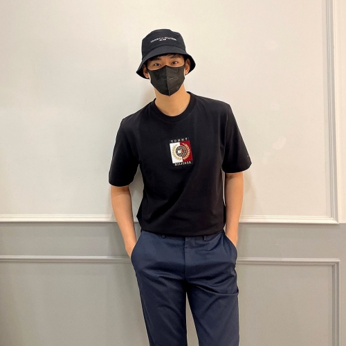 写真には、パンツのポケットに手を入れたままこちらを見つめているキム・スヒョンが写っている。バケットハットを主役に、ジャストサイズのTシャツと涼しげなネイビーのスラックスを合わせたコーディネートが爽やかな印象を与えている。