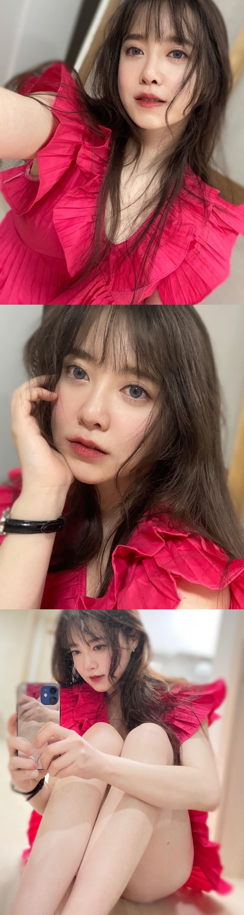 別の写真では、鏡の前でちょこんと座るク・ヘソンが写っている。ドレスから太ももをのぞかせた“生脚美脚ショット”は多くのファンを虜にした。