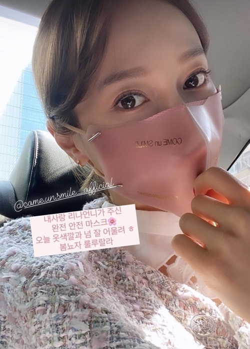 3月11日、アユミはインスタグラムのストーリーに「私の愛、リナお姉さんがくれた完全安全マスク。今日の服の色ととてもよく似合う。春女、ルルララ」という文とともに写真を公開した。