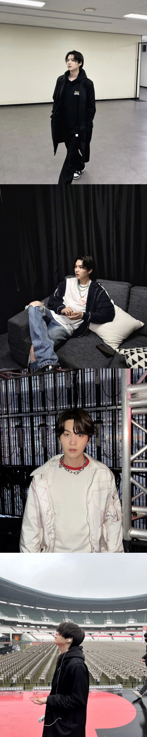 そしてSUGAは「お疲れ様でした」と綴り、ソファーに座る姿や、リハーサル時の様子などを披露。何気ない瞬間もカリスマ性あふれる姿が目を引く。