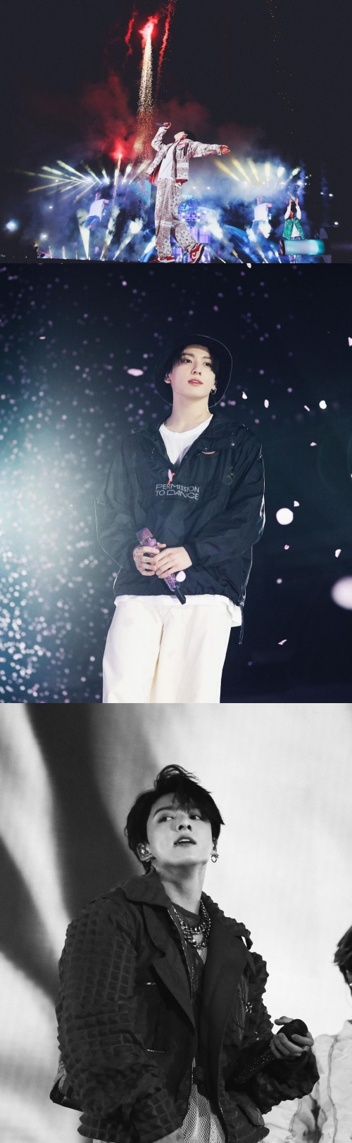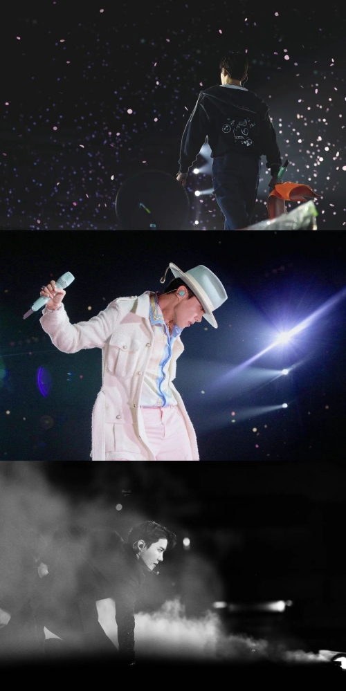 また、RMやJ-HOPE、JUNG KOOKはステージでのパフォーマンス写真を数枚投稿。汗ばみながら真剣にパフォーマンスを披露する姿や、ペンライトの光に包まれながら颯爽と歩く姿など、どれも映画のワンシーンのようだ。