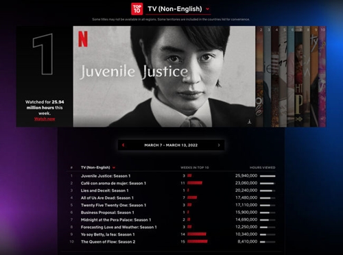 3月16日に「ネットフリックスTOP10」が発表した情報によると、『未成年裁判』なNetflixグローバルTOP10 TV(非英語)部門で2週連続トップに立った。