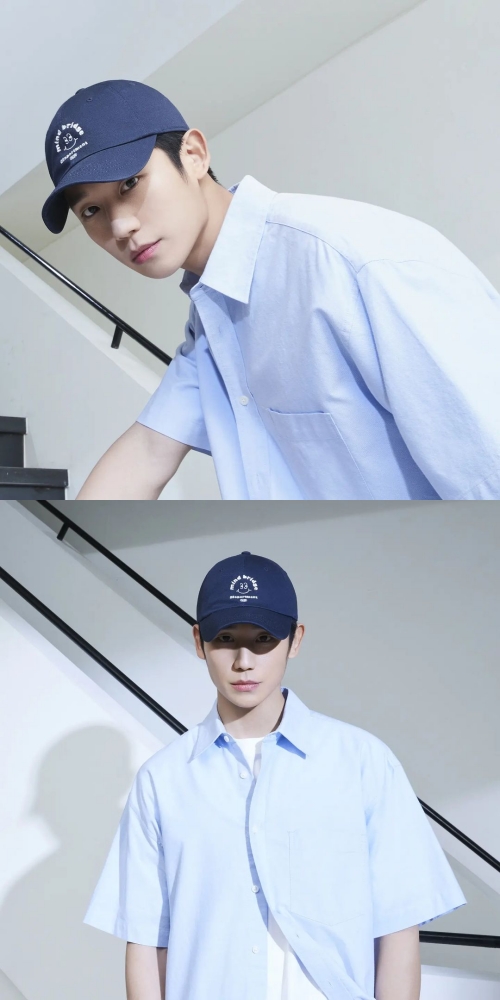 チョン・ヘインは半袖のブルーシャツにベースボールキャップを被ったスポーティーなコーディネート。青を基調とした涼しげなスタイルが、彼の爽やかなルックスや雰囲気によく合っている。