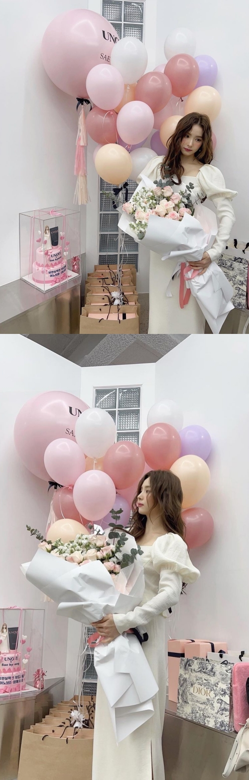 たくさんの風船やプレゼントが置かれた部屋で、大きなバラの花束を抱えているシン・セギョン。純白のロングドレスに身を包み、カールがかった髪を誇る姿は、まるでお姫様のようだ。