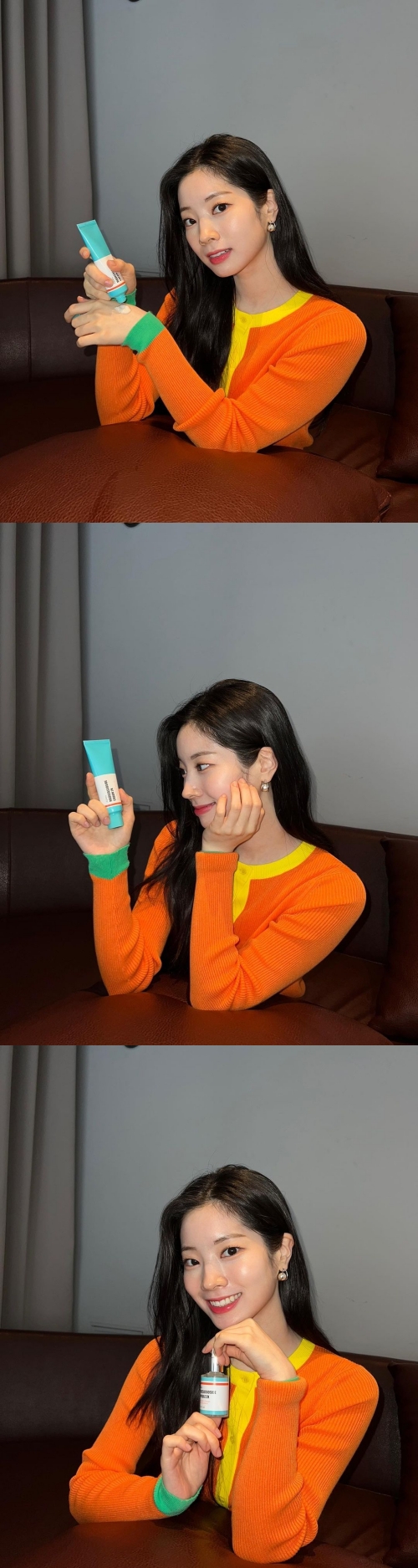 ダヒョンはオレンジが眩しいバイカラーニットを着用している。キュートな笑みを浮かべ、頬杖をついたり顔を傾けたりと、愛らしい仕草でファンのハートを鷲掴みにした。