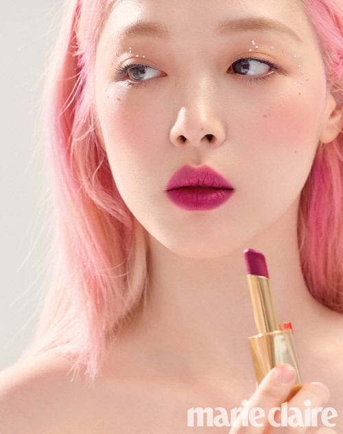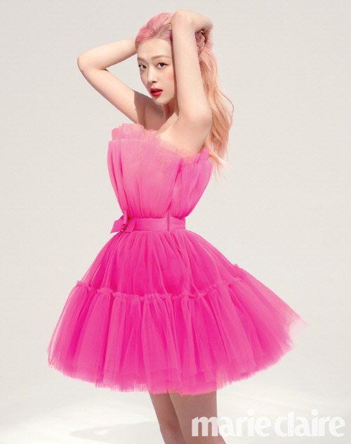 同誌に掲載されたファッショングラビアでは、ソルリがピンク色のヘアカラーと共に華やかで愛くるしい雰囲気を醸し出している。