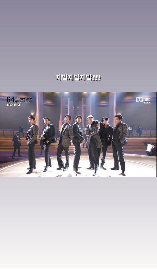 ストーリー機能を通じて、BTSがグラミー賞授賞式で『Butter』のステージを披露した際の写真を掲載するとともに、「どうかどうかどうか!!」と綴った。