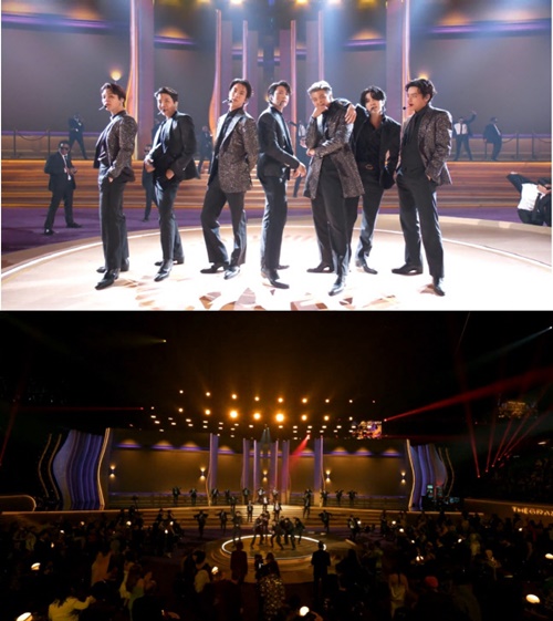 管制センターで命令を下すJINを皮切りに、空中からワイヤーでステージに降り立つJUNG KOOK、さらには客席からJIMIN、J-HOPE、SUGA、RM、Vが次々と登場するというユニークなオープニングを完成させた。