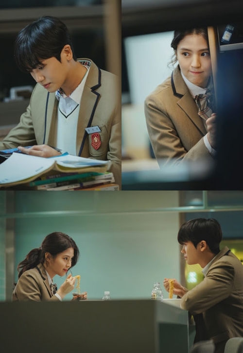 公開された写真のソヌとウンスは、制服姿で図書館にいる。本を熱心に読むソヌと、そんなソヌを茶目っ気たっぷりの表情で見つめるウンスの姿が微笑ましい。また別の写真では、お互い向かいあってカップラーメンを食べており、見る者をときめかせた。