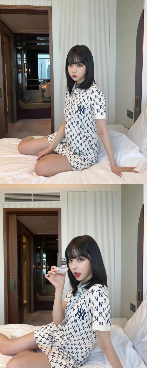 写真には、ベッドに座ってこちらをじっと見つめるWINTERの姿が収められている。今やチャームポイントのボブヘアに、濃いめのピンクメイクが愛らしい印象だ。