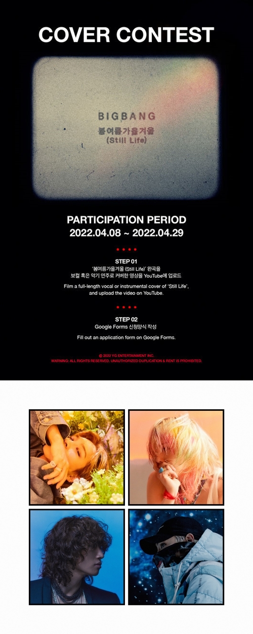 コンテストへの参加は、『Still Life』のボーカルまたは楽器でカバーした映像をハッシュタグ(#BIGBANG、#봄여름가을겨울、#StillLife、#StillLife_CoverContest)とともにYouTubeにアップロードし、Googleフォームの申請を作成して提出する。