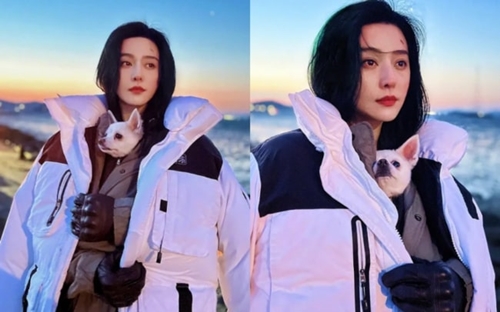 写真には、顔のあちこちが傷つき、やや充血した目のファン・ビンビンの姿が写っている。撮影のために施したメイクと見られ、厚手のダウンジャケットを着て子犬を抱いている。
