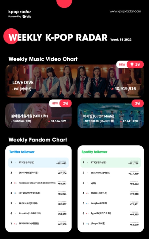 K-POPレーダーによると、IVEの『LOVE DIVE』のMVは第15週目の集計期間中(4月3日~4月9日)、およそ再生回数4092万回を記録し、“グローバルスーパールーキー”の名に違わぬ記録を誇った。