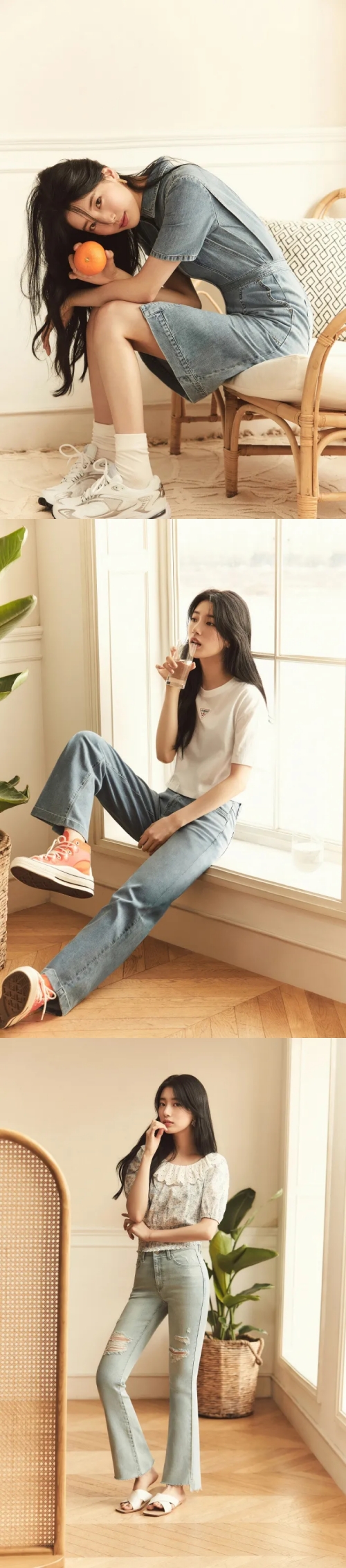 ルックブックには、デニムワンピースをはじめ、ロゴTシャツ、フレアデニムなど、さまざまなアイテムを着こなすペ・スジが写っている。 圧倒的な美貌を誇りながらナチュラルな魅力で魅了した。