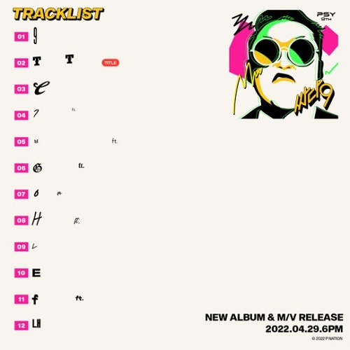続いて公開されたトラックリストイメージによると、今回のアルバムには計12曲が収録されている。12曲中、6曲にフィーチャリングアーティストが参加し、PSYの9枚目のフルアルバムの期待を高めた。