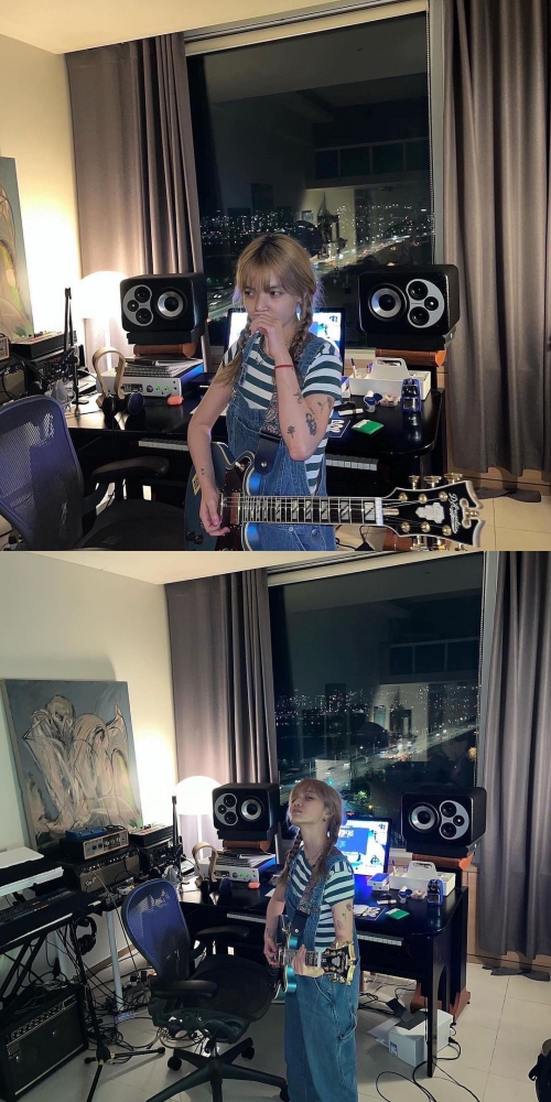 写真には、さまざまな音楽機器の前でギターを持ったジミンが写っている。