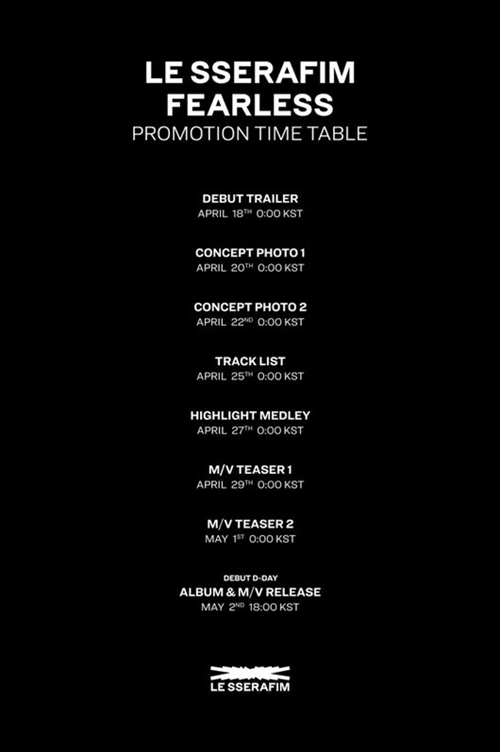 タイムテーブルによると、LE SSERAFIMは4月18日のデビュートレーラーを皮切りに、2種類のコンセプトフォト、トラックリスト、ハイライトメドレー、MVティーザーなどを順次公開する。