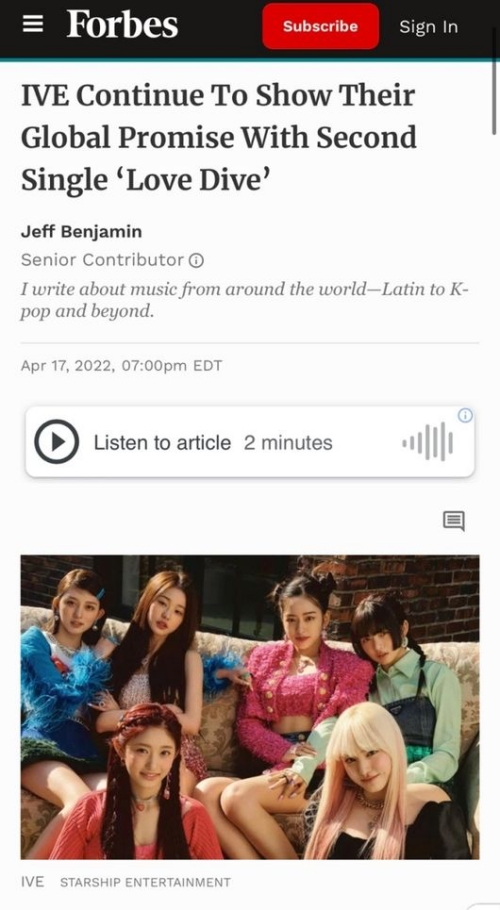 アメリカの経済紙『Forbes』は最近、「IVEが2枚目のシングル『LOVE DIVE』でグローバル成長の可能性を示し続けている」という記事を掲載した。
